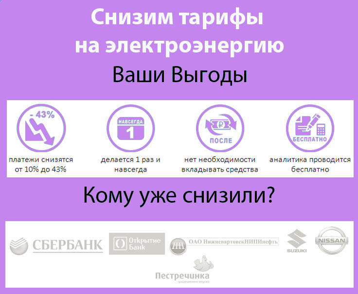Снизим тарифы на электроэнергию. Как снизить цену на электроэнергию документальным путём на 43% без вложений? Потребители электроэнергии зачастую пытаются снизить платежи за эл.энергию техническими способами – проводят энергоаудит, меняют освещение, устанавливают энергоэффективное оборудование. Однако потребители упуска… Читать дальшеют из вида саму цену электроэнергии (руб./кВт*ч), по которой они оплачивают своё потребление. Большинство считает, что цену на электроэнергию никак нельзя изменить. Это заблуждение. Цену на электроэнергию можно снизить документальным путём. Суть кроется в умении использовать тонкости энергетического законодательства и работы рынков электроэнергии. Можно использовать порядка 97 организационно-юридических комбинаций – о скольких из них знаете Вы? Иногда можно вернуть переплаченные денежные средства за несколько последних лет. Максимальное снижение цены электроэнергии – на 1,9 руб./кВт*ч (без НДС) в Республике Татарстан. Как? Цена на электроэнергию состоит из различных составляющих. Все составляющие цены анализируются отдельно, определяется в каком порядке и в каком объёме лучше эти составляющие оплачивать. Сам объект энергопотребления рассматривается с точки зрения удалённости от основных потребляющих и генерирующих объектов в регионе. Глубокая аналитика, а также необходимые организационные и юридические действия позволяют не только снизить цену, но и вернуть переплаченные за несколько лет денежные средства. Стоимость БЕЗ каких-либо вложений. Всё делается документально. Услуги оплачиваются с возникшей экономии. Срок окупаемости, как правило, менее года. Заблуждения Суды – в большинстве случаев судов не требуется, всё делается мотивированным обоснованием. Мы ведём диалог с поставщиками электроэнергии, зная как иногда они могут пользоваться своим положением, чтобы «надавить» на потребителя. Отключат электроэнергию – не отключат, если Вы за неё платите. Поставщики электроэнергии не согласятся – согласятся, если вести диалог мотивированно и заранее правильно подготовив свою позицию. Что необходимо? Направить нам на аналитику следующие документы: Акты разграничения балансовой принадлежности с электросетевой компанией; Договор энергоснабжения с приложениями; Счета-фактуры за электроэнергию за последние 12 месяцев. Аналитика бесплатна. По её результатам мы отразим на сколько можно снизить платежи. Если бы у Вас была возможность снизить цену на электроэнергию и при этом ничего не вкладывать, Вы бы ей воспользовались?